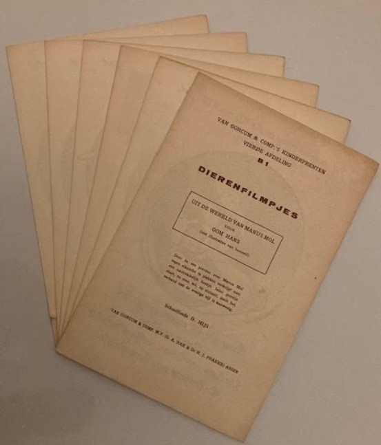 zj., 6 dunne dubbele kartonkaarten (13 x 20 cm.) met illustraties van Oom Hans, Schoolfonds D. Mijs.