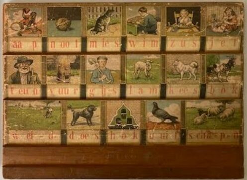 De uitgave 1932 t/m 1949 bij Hoogeveen’s leesmethode, ills. Cornelis Jetses, het plankje is van hout beplakt met papier en heeft slijtage (zie foto), 22 x 30 cm., de bok kijkt naar rechts. Er zijn geen lettertjes bij.
